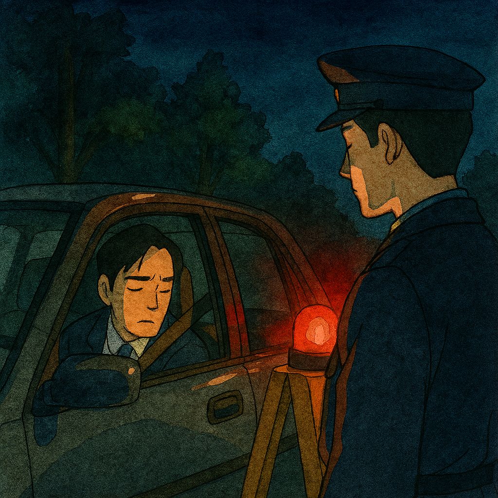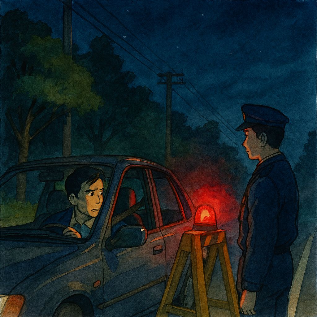 午後10時過ぎ、検問の赤いライトが路肩に浮かぶ。