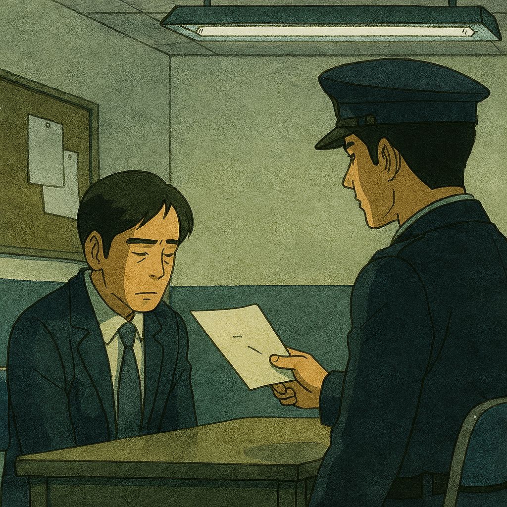 警察署の蛍光灯の下、無機質な椅子に座らされる。